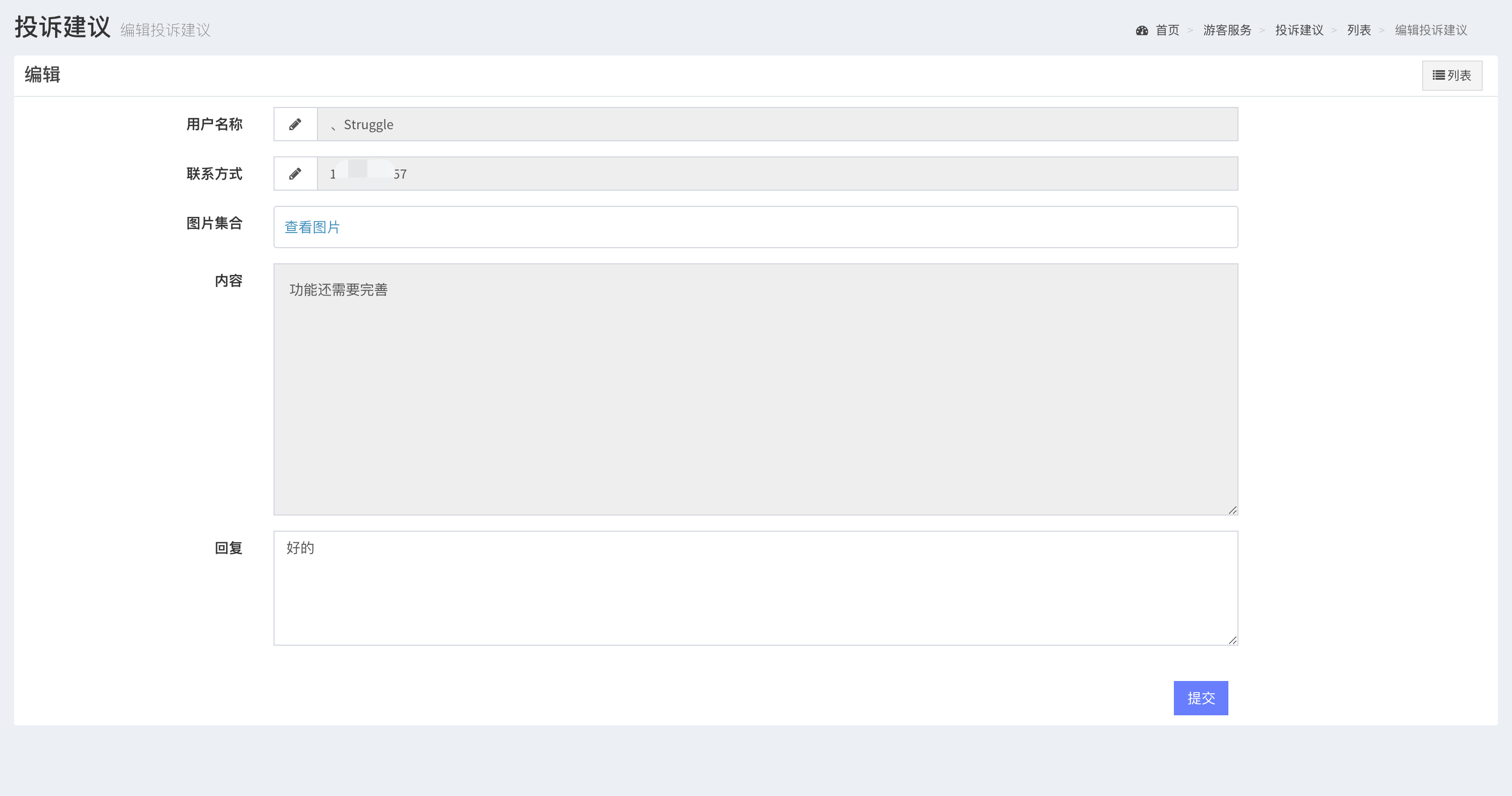 實(shí)現(xiàn)游客投訴建議移動(dòng)端發(fā)布,景區(qū)管理人員后臺(tái)查看、處理并迅速作出回復(fù)。